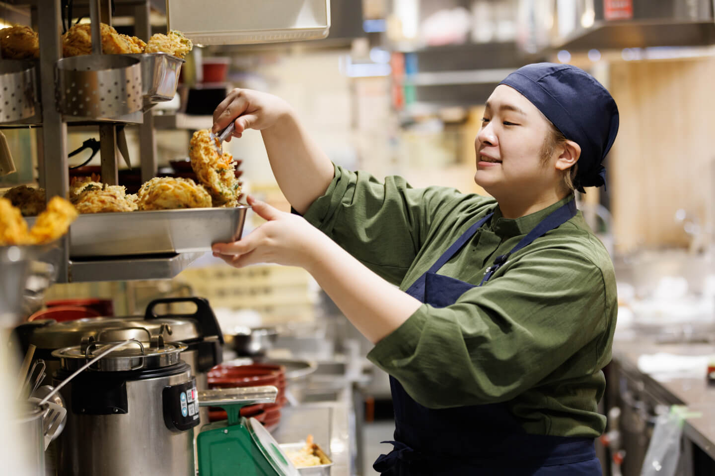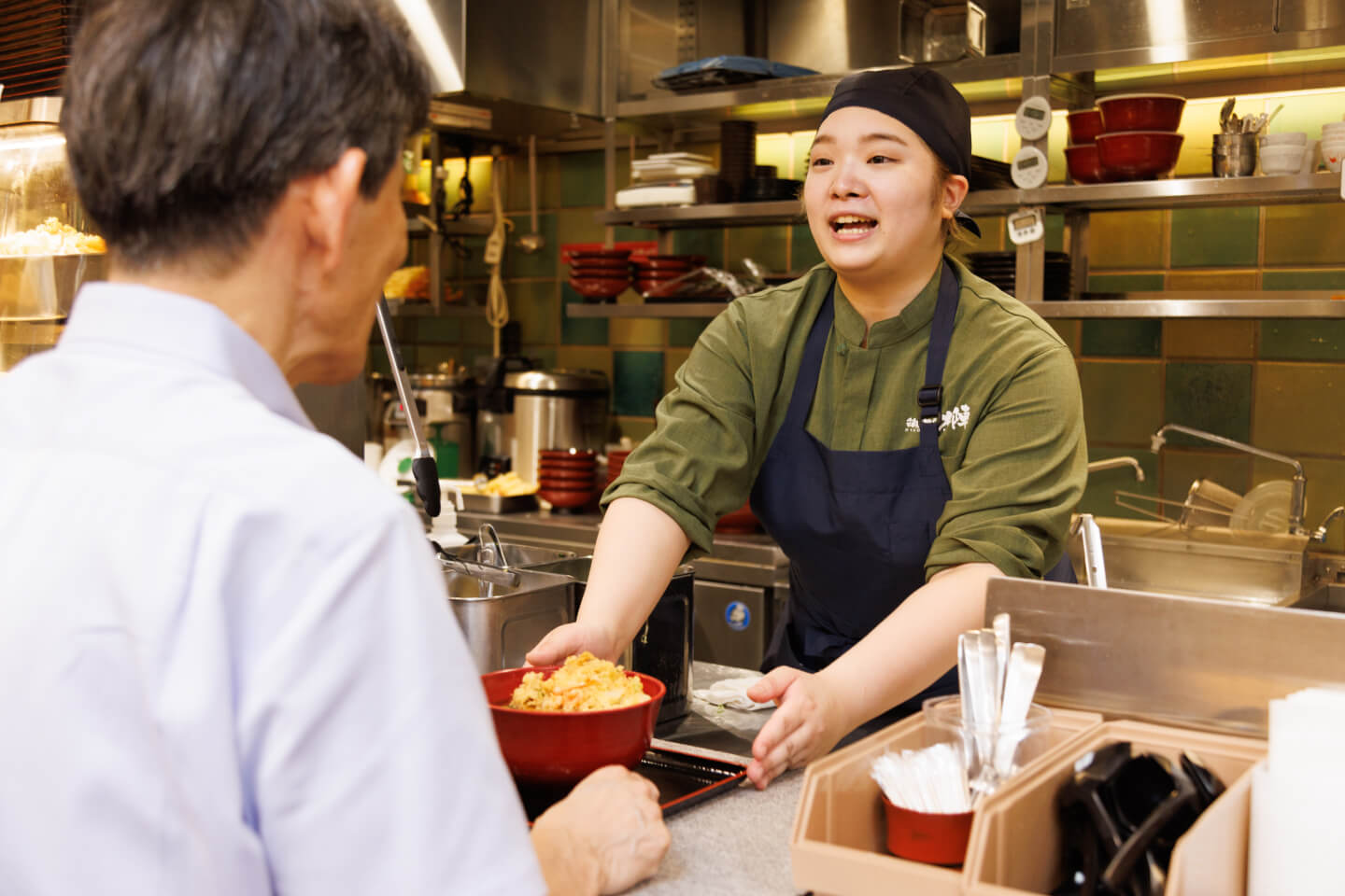 仕事内容は、箱根そばの方は、そば茹で、天ぷら揚げ、盛り付け、お客さまへの商品提供から下げ物の洗い場、食材の仕込みなどを、おだむすびの方では、おむすびを握るところから、販売、レジ打ちなどの接客を行っています。その他、券売機の締め作業や売上管理、棚卸や発注、パートさんやアルバイトの方の指導など、さまざまな仕事を行っています。営業時間は午前7時から22時のためシフト制で働いており、早番の日には始発電車で職場に向かいます。社員とパート、アルバイトの方を含め、朝は4人、昼は6人、夜は5人程度で店舗を運営します。