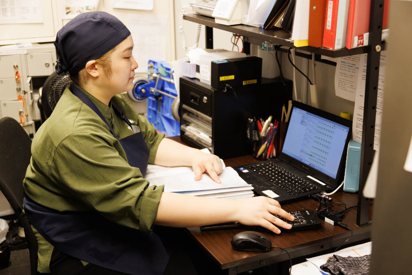 事務作業。椅子に座ってほっと一息つける時間。